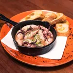 Al ajillo en sartén de hierro con ají cacho de cabra y tostadas,